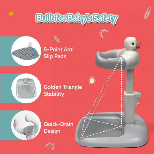BEBECAN Adjustable Baby Shower Standing Support with Seat & Anti-Slip Base for Bath Tub, 2 in 1 Stand Up Safe Bathing for 6–36 Months, Free Mother Hands with Shower Holder