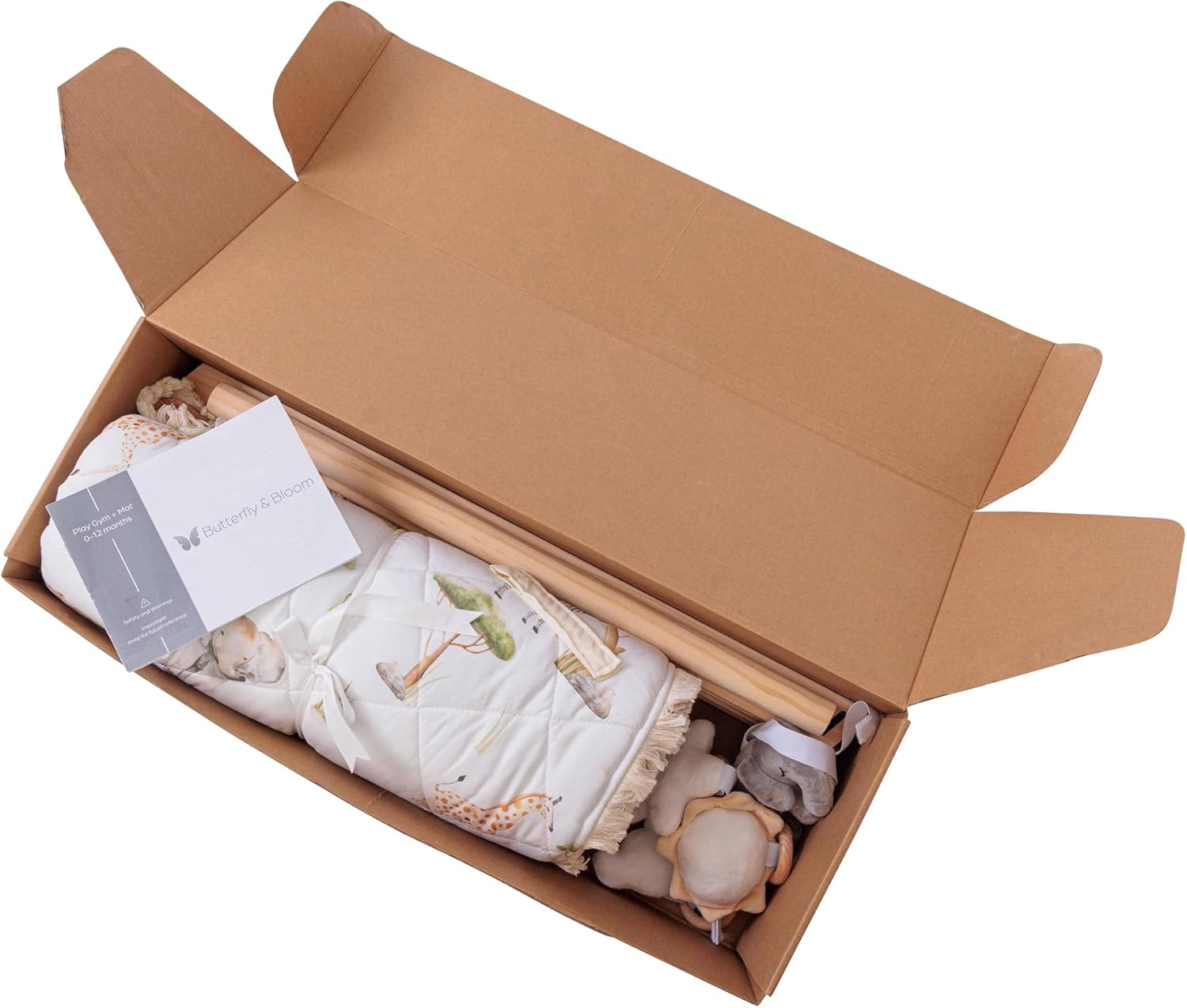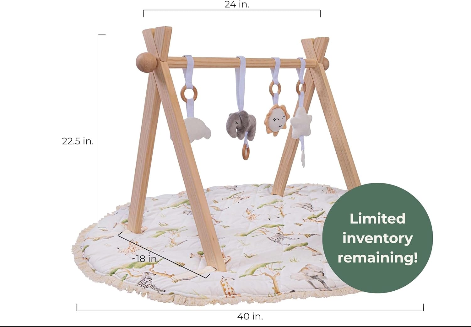 Montessori Wooden Baby Play Gym and Mat | Heirloom-Quality FSC Pine, Reversible Washable Mat, Includes Hanging Toys | Neutral Baby Activity Gym for Newborn to 6 Months