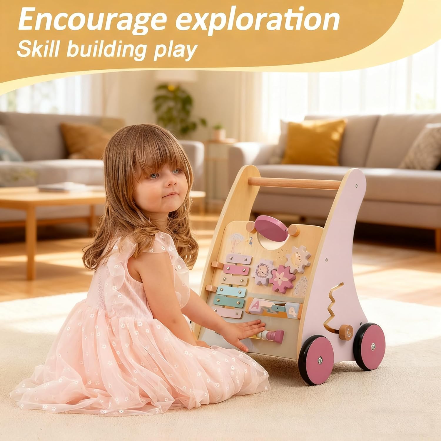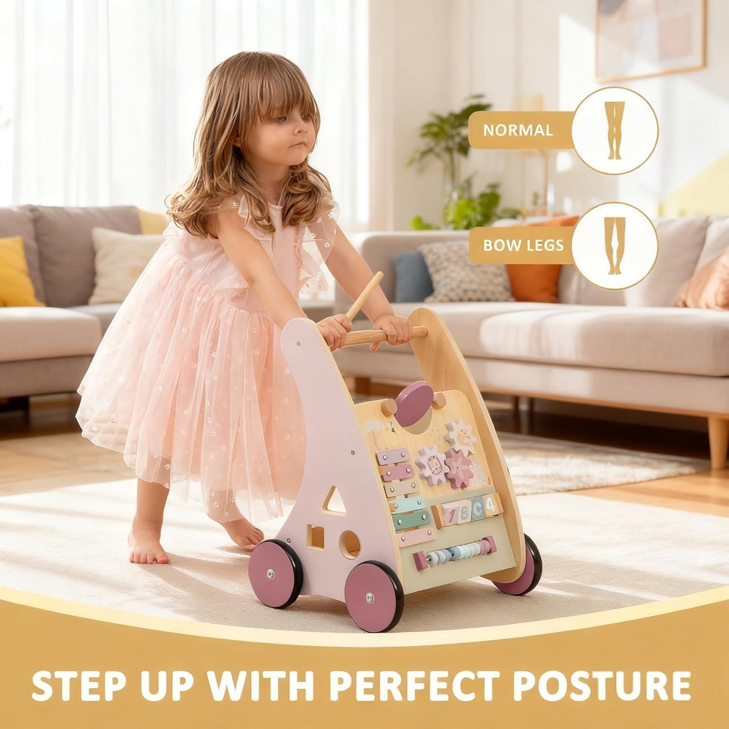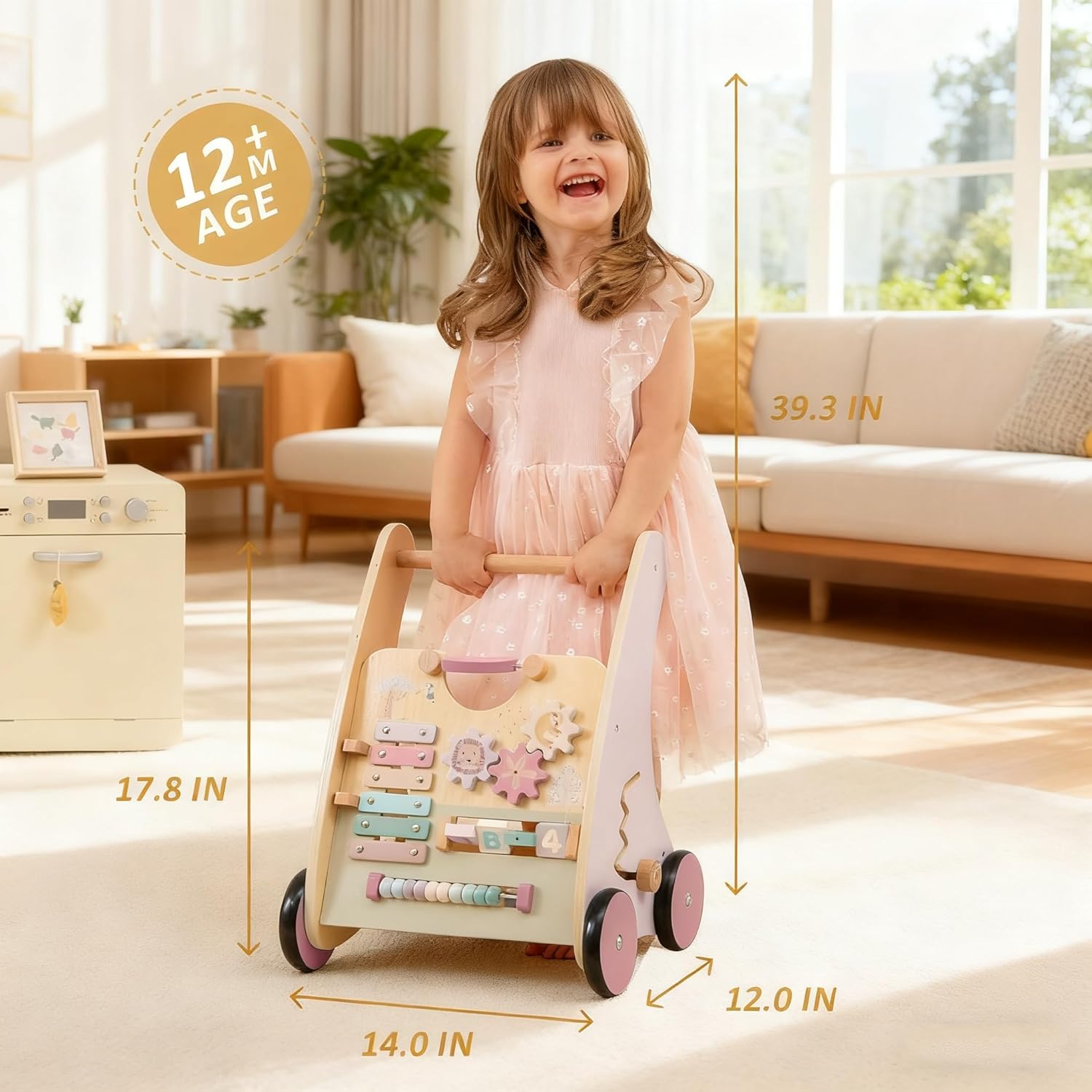 Wooden Baby Walker with Anti-Tip Design, Montessori Activity Center for Babies 6-18 Months, Sit-to-Stand Push Toy with Sensory Features – Ideal Learning Walk Gift for Toddlers