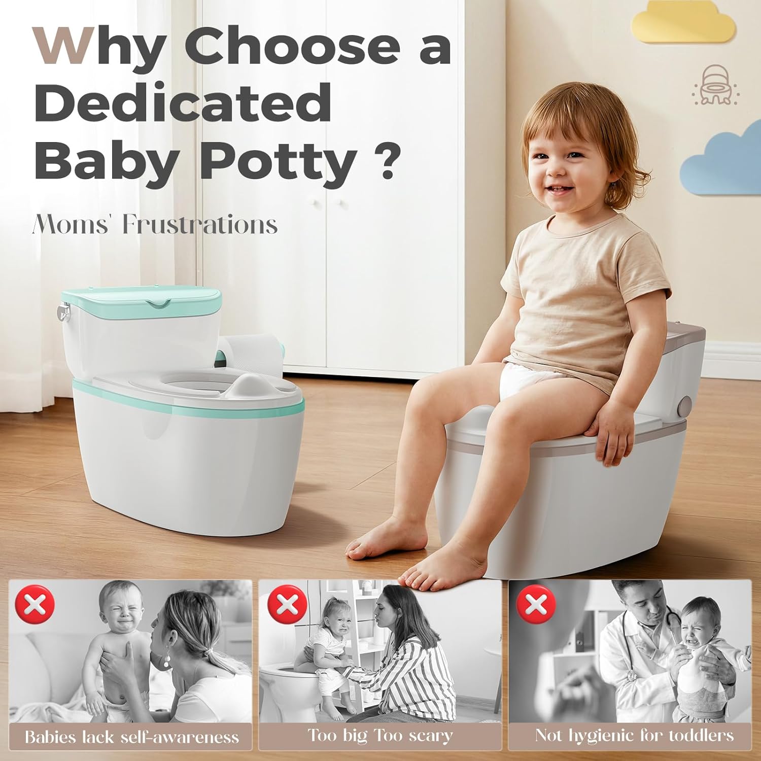 • Parent-Friendly Features – Lightweight and portable design makes it easy to move between rooms; potty can be wiped clean or washed as needed.