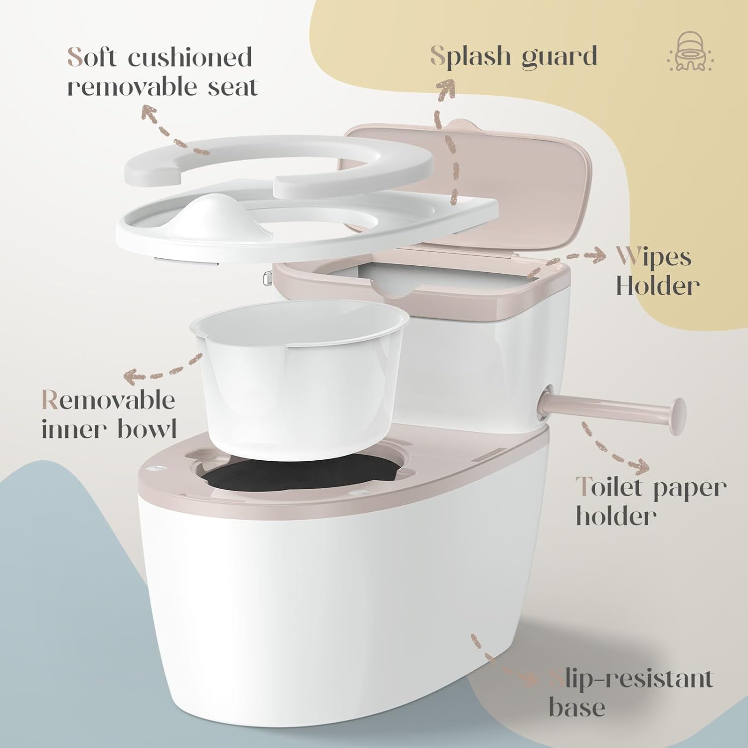 • Built-in Splash Guard & Anti-Slip Base – Helps prevent messy spills and keeps the potty stable for safe use.